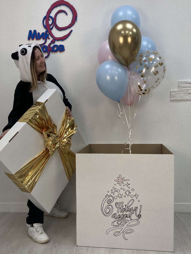 Гелиевые шарики будут радовать Вас, минимум двое суток. В домашних условиях могут пролетать до 3-х недель. Цвет коробки белый. Цвет воздушных шаров может быть разный, уточняйте у менеджера.