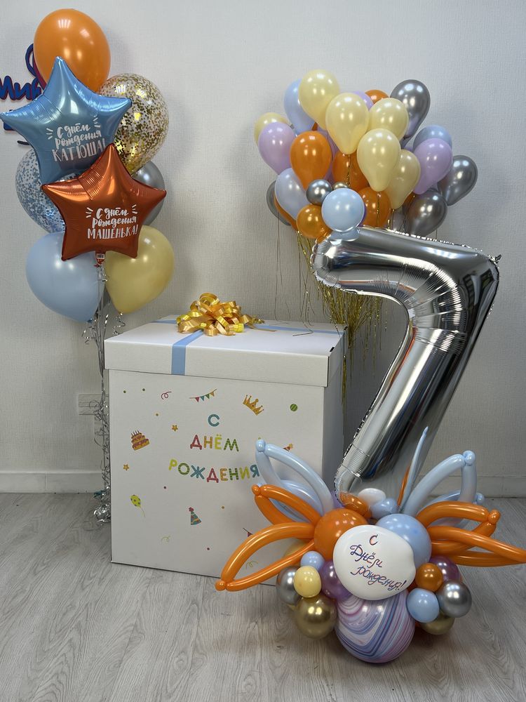 Гелиевые шарики будут радовать Вас, минимум двое суток. В домашних условиях могут пролетать до 3-х дней. Цвет коробки белый. Цвет воздушных шаров, как и номинал цифры, может быть разный, уточняйте у менеджера.