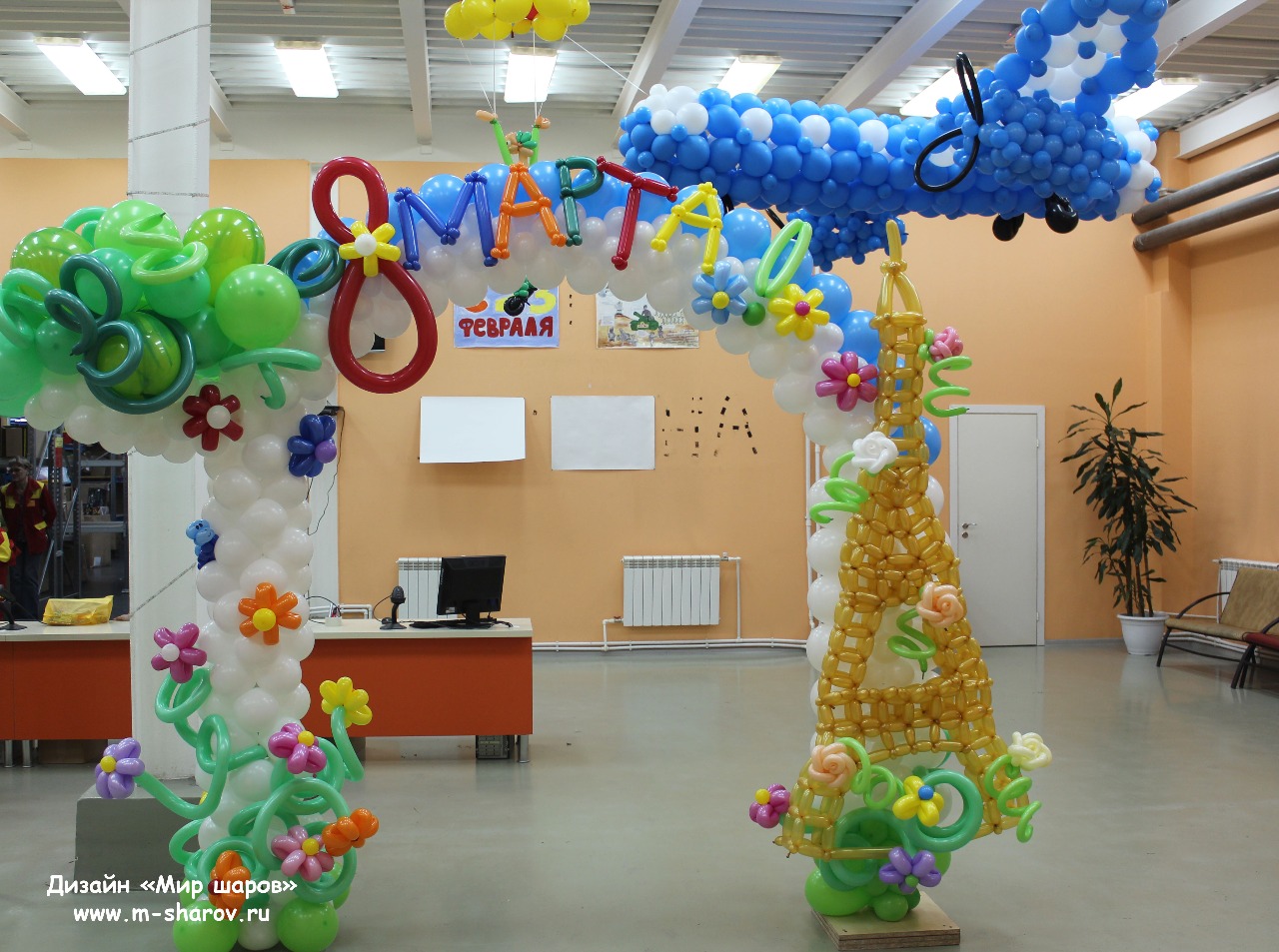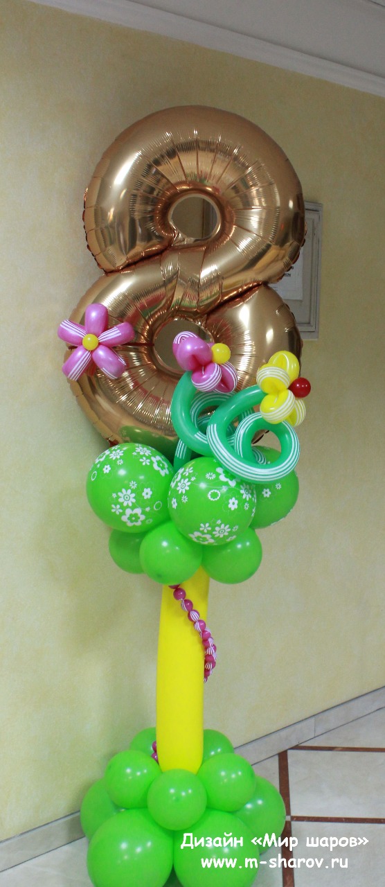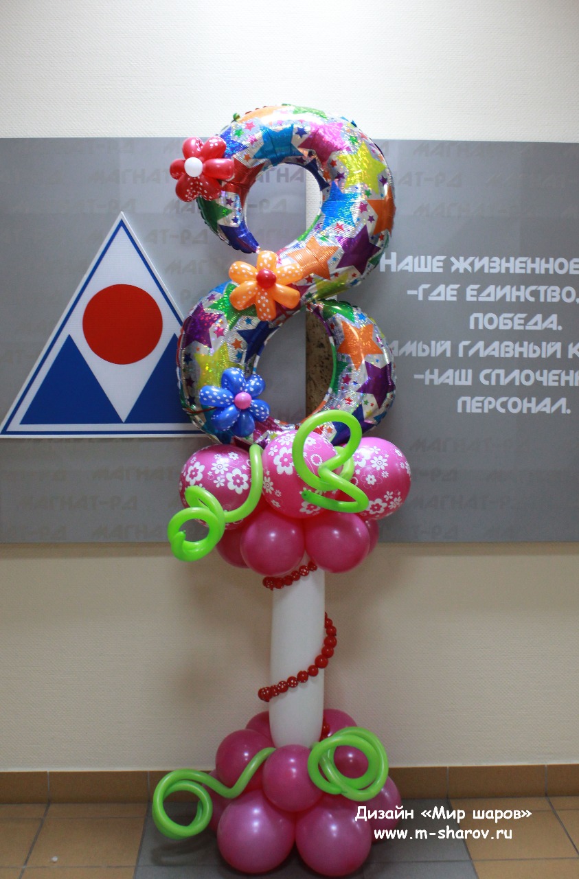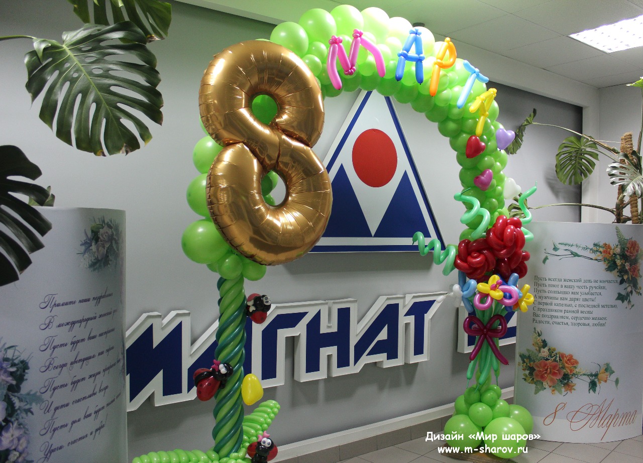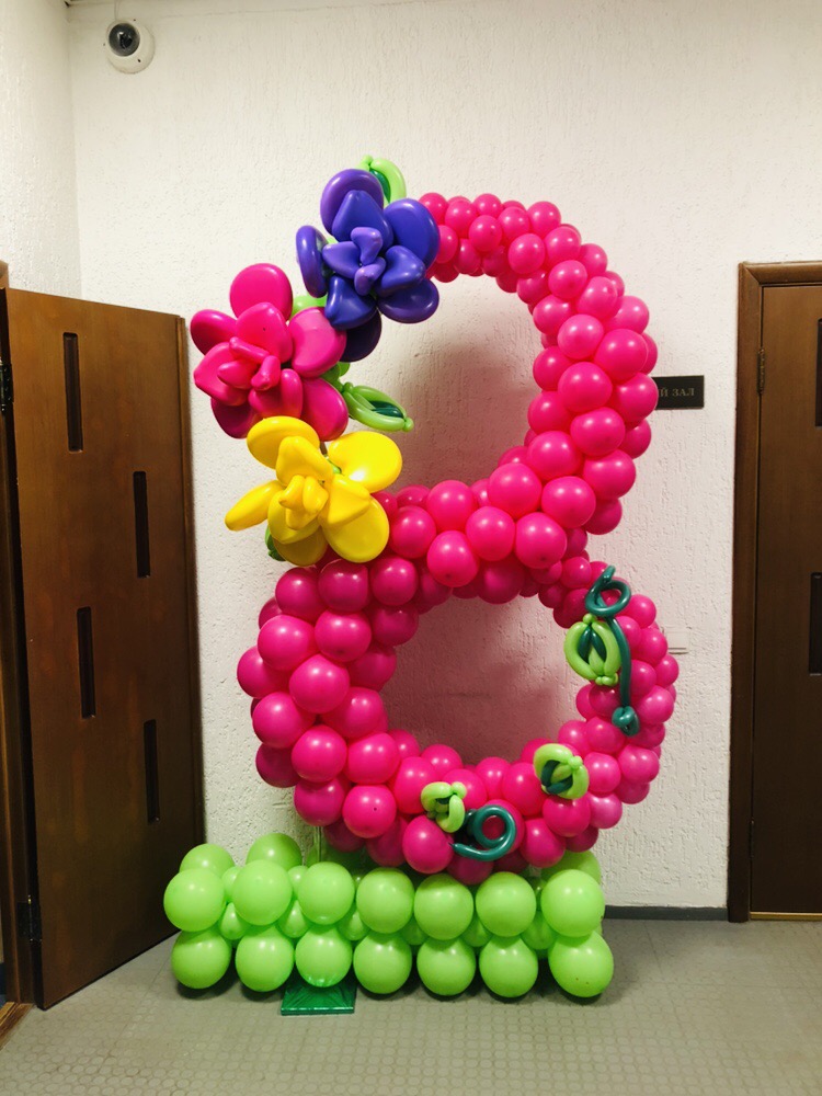Подарите вашим женщинам оформление из воздушных шаров на 8 марта, красиво оформите место проведения корпоративного мероприятия и подарите букеты из разноцветных шариков.